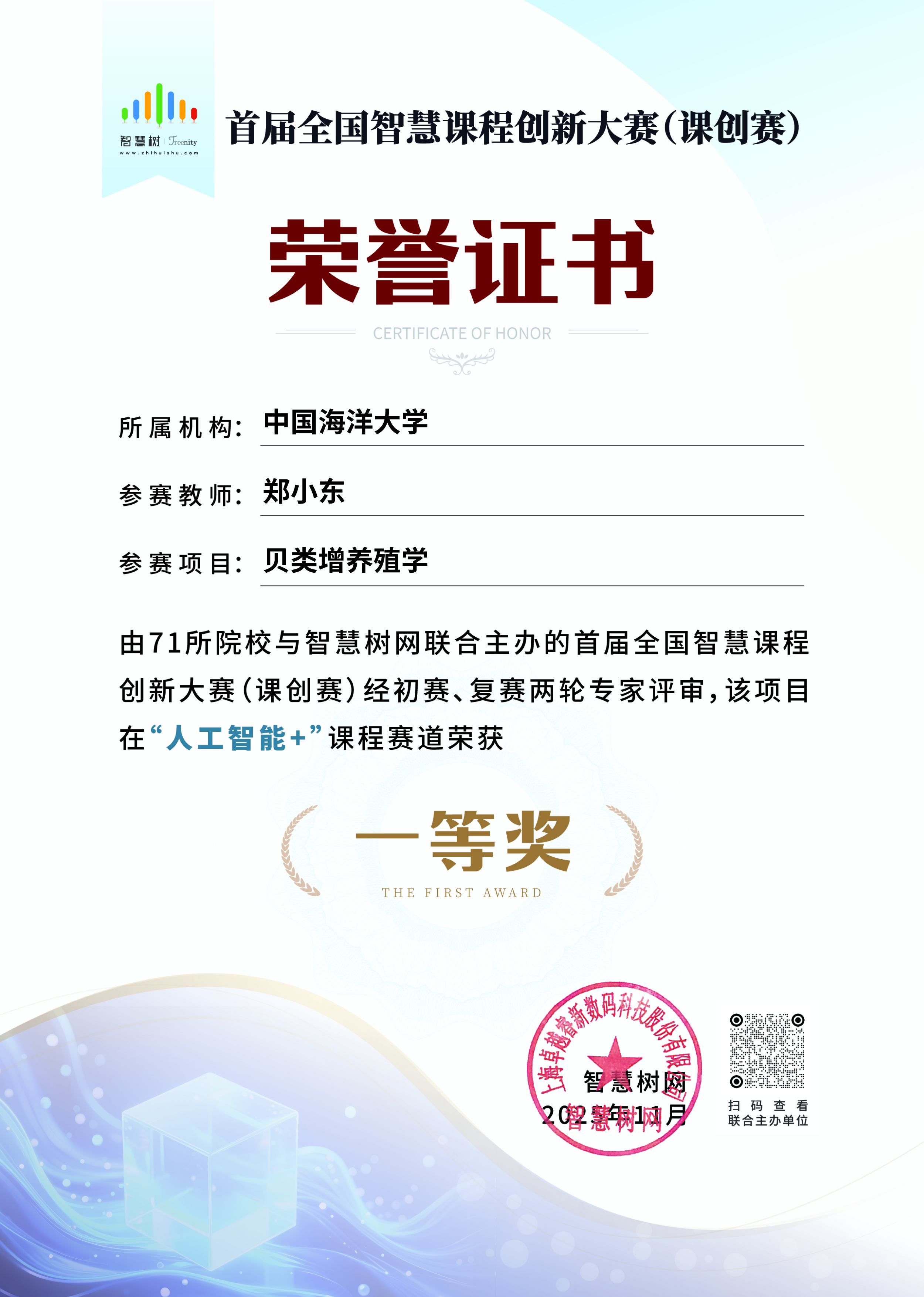 近日,首届“智慧树杯”全国智慧课程创新大赛获奖名单正式公布,色播 郑小东教授主讲的“贝类增养殖学”课程,凭借优秀的课程设计与教学创新实践,在比赛中脱颖而出,荣获一等奖。